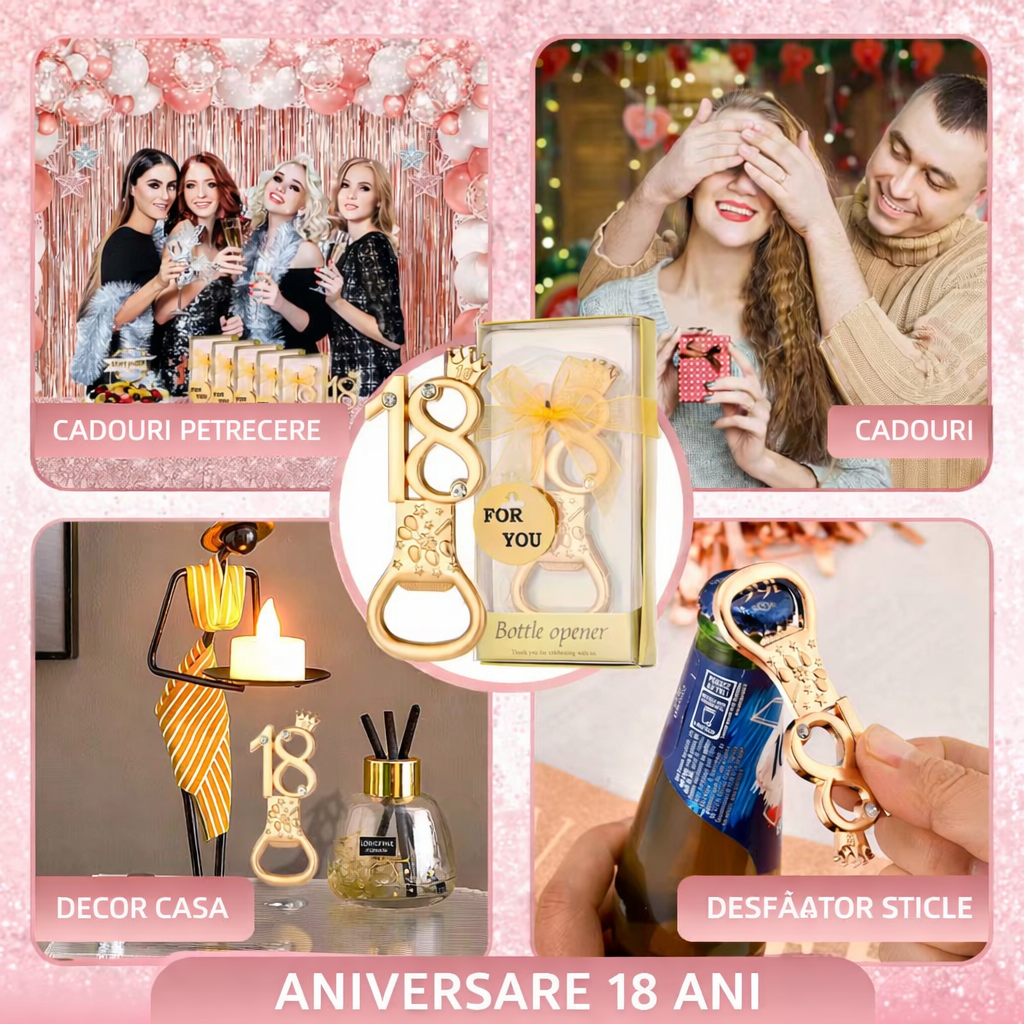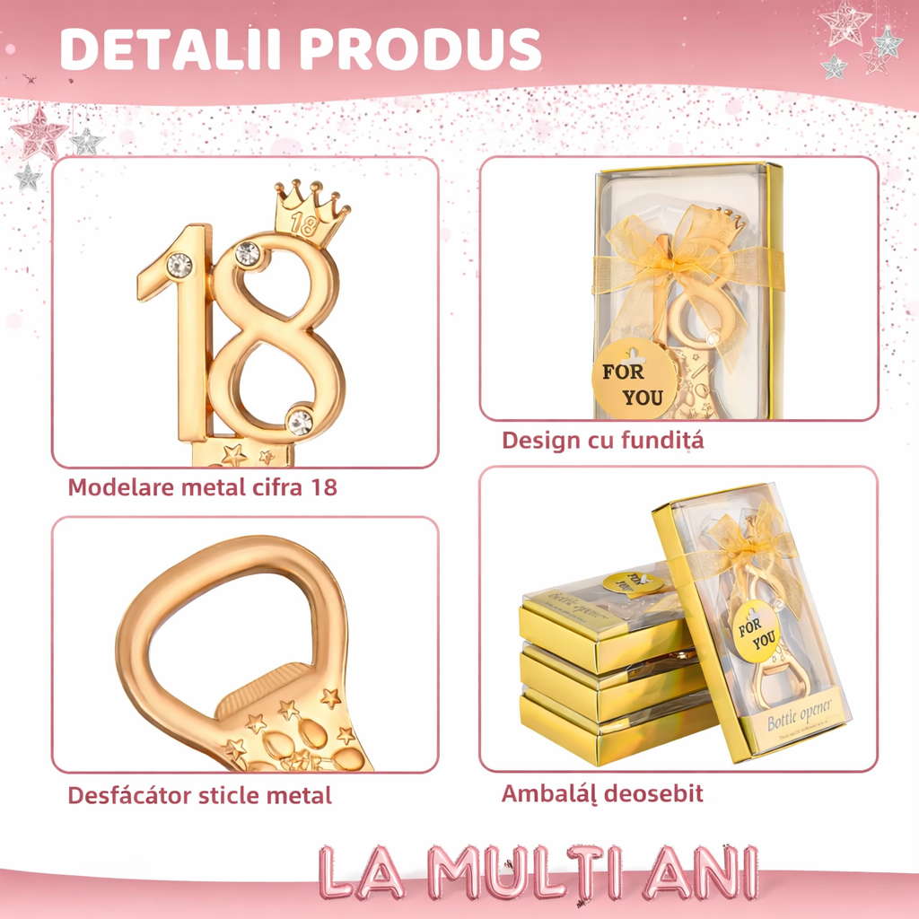 Desfăcător de sticle elegant, sub formă de cifră „18”, creat special ca suvenir pentru petrecerile de majorat. Realizat din metal cu finisaj auriu și decorat cu elemente festive, acest produs este un cadou ideal pentru invitați, marcând într-un mod memorabil împlinirea vârstei de 18 ani.