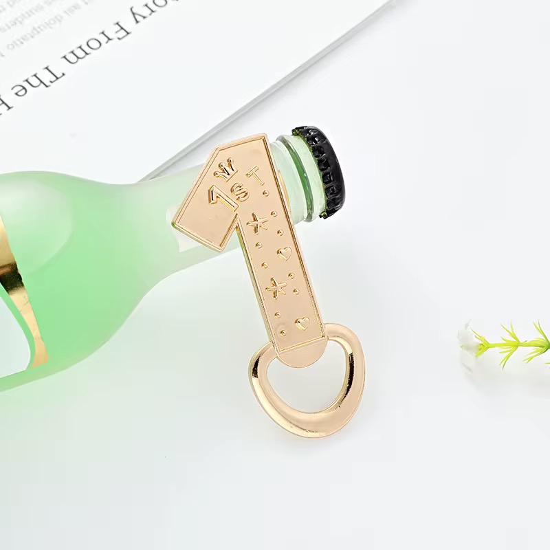 Mărturie elegantă pentru aniversarea de 1 an, sub formă de desfăcător de sticle în formă de cifră „1”, realizată în finisaj auriu. Designul delicat, decorat cu simboluri festive, transformă acest produs într-un cadou special pentru invitații prezenți la petrecerea copilului.
