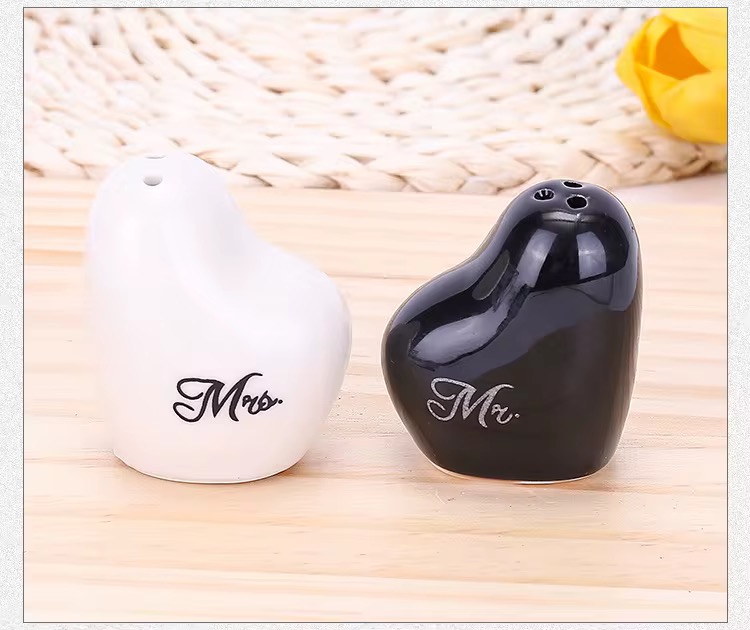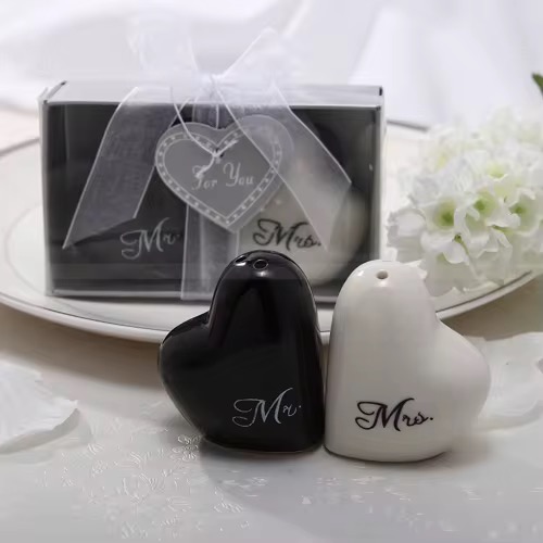 et elegant de solnițe ceramice „Mr & Mrs” în formă de inimă, perfect ca suvenir pentru nuntă sau logodnă. Design modern alb-negru, ambalate cadou – ideale pentru invitați. Cuvinte cheie: suvenir nuntă, Mr & Mrs, solnițe inimă, cadou invitați, decor nuntă.
